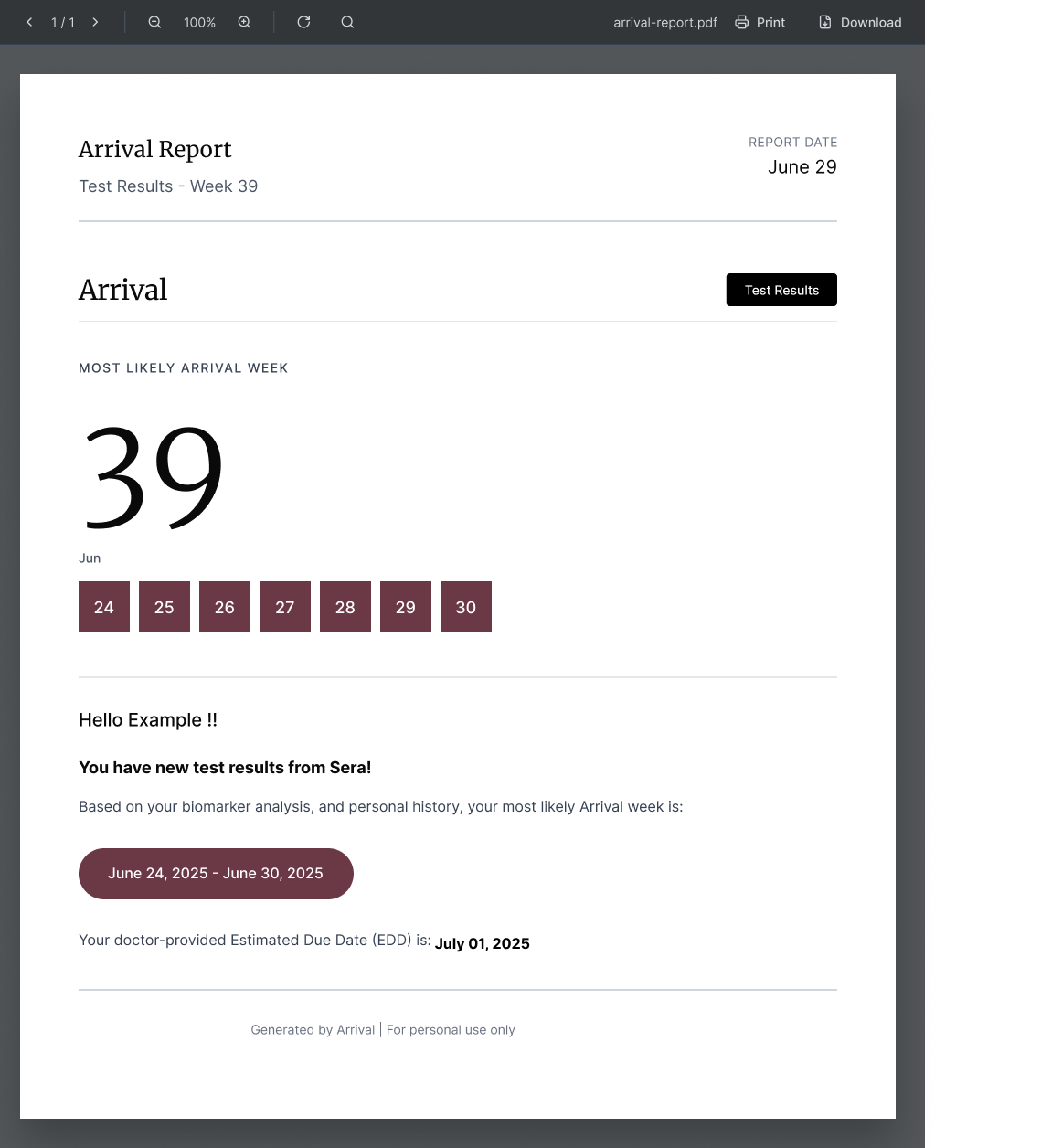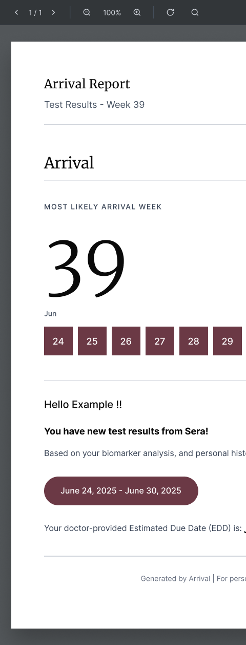 Meet Arrival™, an at-home blood test offering a precise, personalized delivery-week prediction to support pregnancy planning.